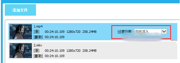 3、添加好视频后在“过度效果”中选择一个过度效果,不选的话视频衔接会非常突兀;