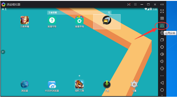 1、打开逍遥安卓模拟器,在其右侧的功能列表中找到“应用安装”功能,如下图: