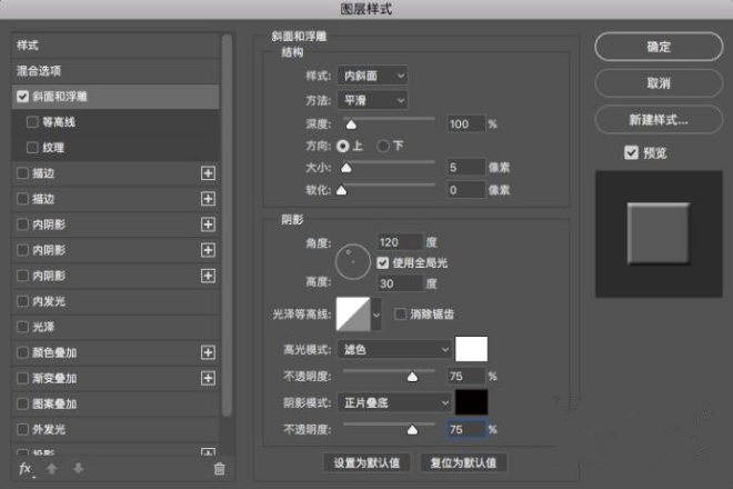 5、双击文字图层进入图层样式,添加内斜面样式、平滑方法的斜面浮雕,深度100%,大小5,角度120,高度30。