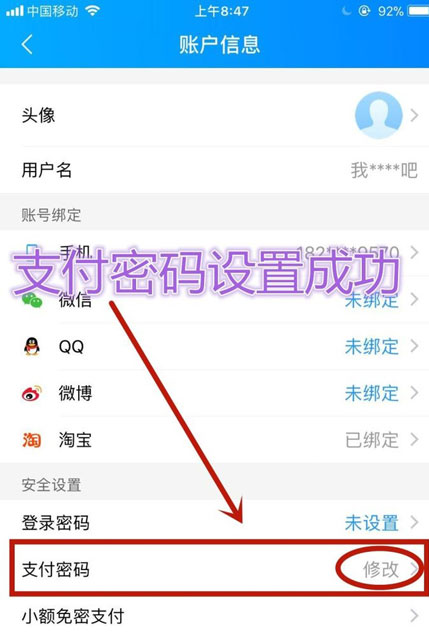8、当“支付密码”处显示“修改”字样,表明支付密码修改成功。