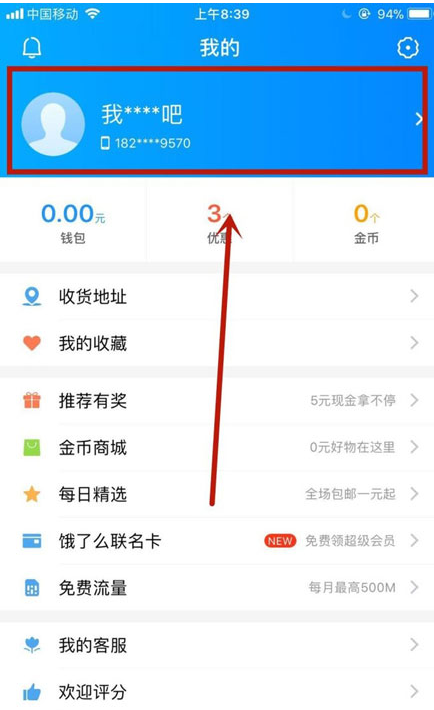 1、首先在手机上打开饿了么app,进入首页,然后点击“我的”,如下图所示。