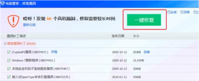 点击后,它会扫描系统上存在的漏洞,扫描完,直接点击‘一键修复’就可以了。