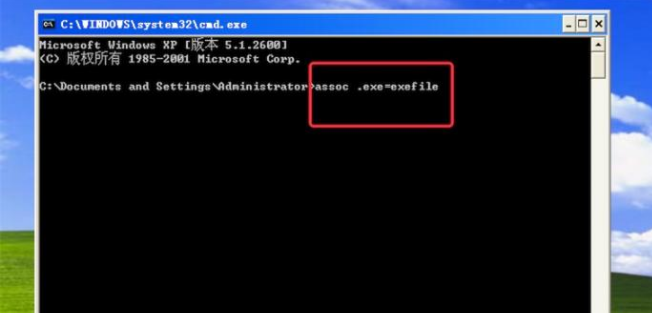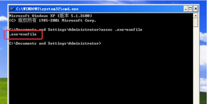 4、按了回车键后,窗口上有输出.exe=exefile,则成功把关联文件修复好了。现在exe文件就能打开了。