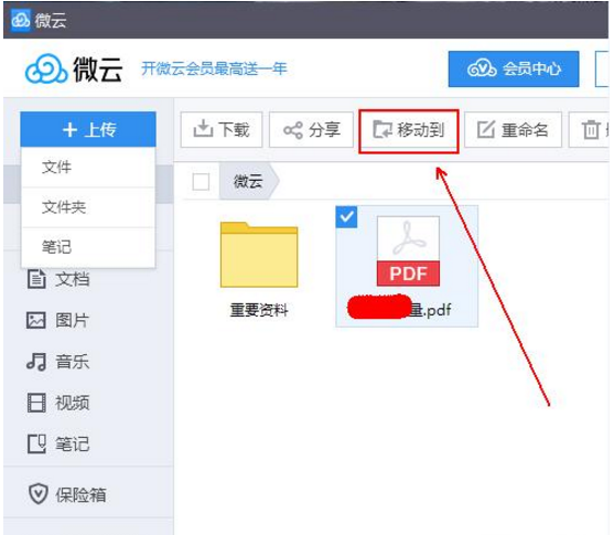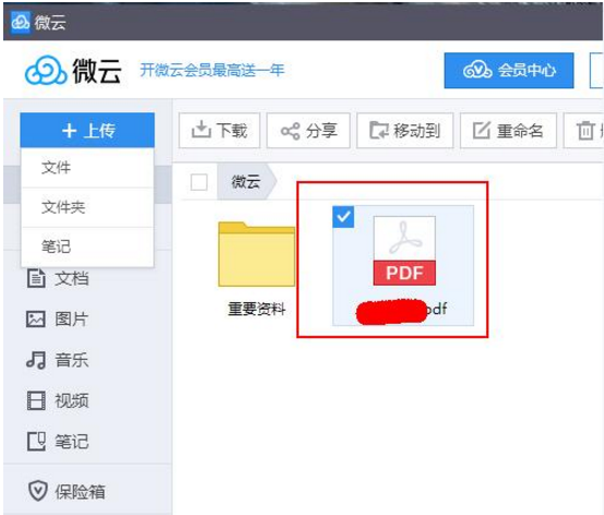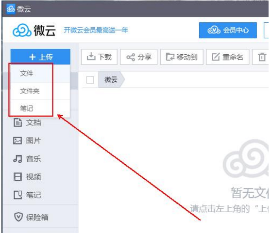 4、在“微云”的左上角,找到“上传”按钮。将光标放到“上传”按钮上会弹出一个菜单列表,微云目前主要提供三种上传服务,即单个文件、文件夹及笔记上传。如果我们直接点击“上传”按钮,则直接默认为单个文件的上传。