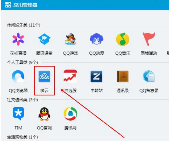 2、在“应用管理器”中的“个人工具类”中点击“微云”应用,