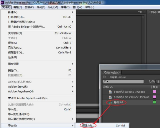 11、选择我们的序列文件,执行:文件--导出--媒体快速输出我们做好的影片。