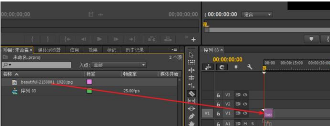 5、将我们导入的素材拽入序列内,默认图像时长为3秒。