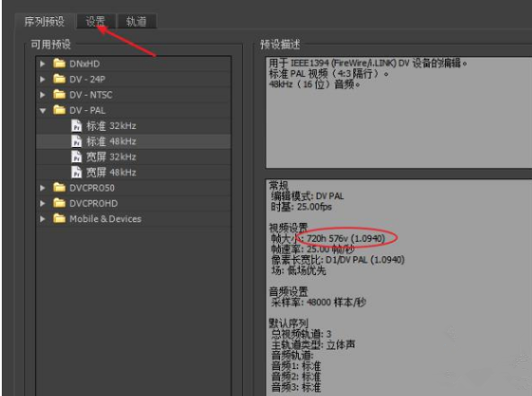 2、我们在标准的48KHz(DV-PAL)预设下,快速进入设置界面更正我们的尺寸。