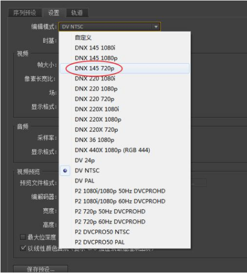 3、在编辑模式下选择:DNX 145 720p,快速将我们的分辨率的尺寸更改为:1280×720。