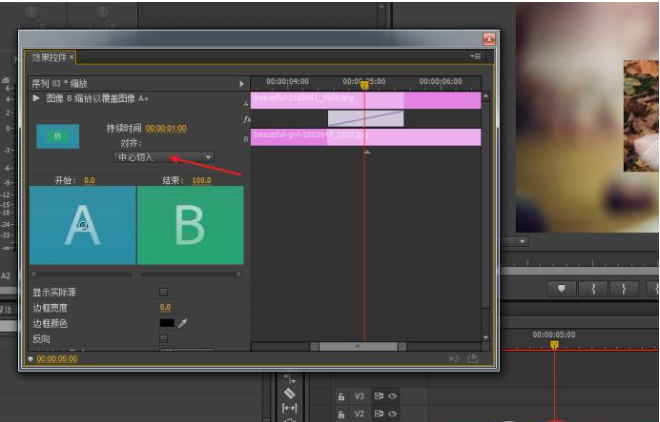 10、点击我们中心素材的位置,快速将我们效果控件面板内的对齐方式设为:中心切入。