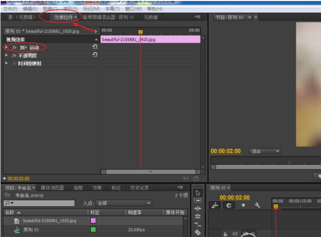 6、点击我们序列上的素材,找到效果控件面板并进入运动参数选项。