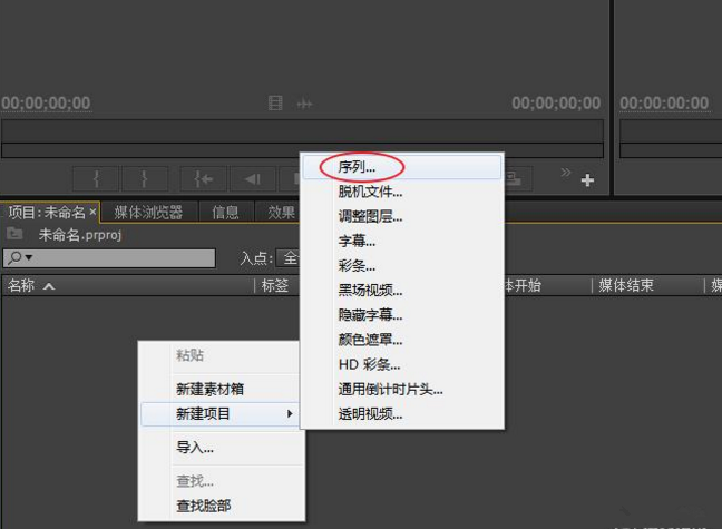 1、打开Adobe Premiere,找到我们的项目面板,快速新建一个新的序列文件。