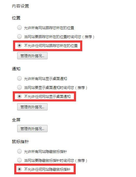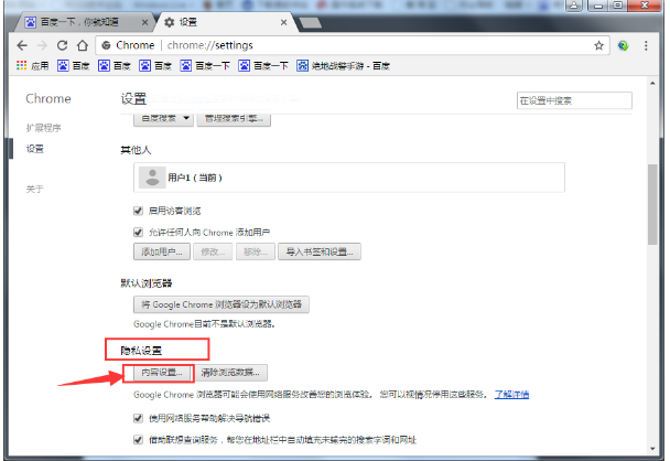 3、之后在高级设置中找到“隐私设置”里的“内容设置”如下图: