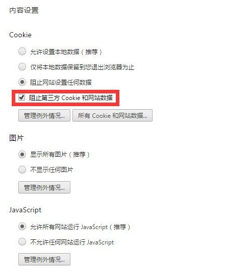4、勾选“阻止第三方Cookie和网站数据”;