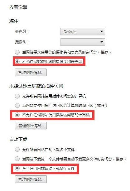6、继续往下拉,看到“媒体”“未经过沙盒屏蔽的插件访问”“自动下载”都勾选不允许任何网站自动下载多个文件。