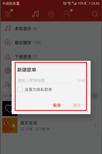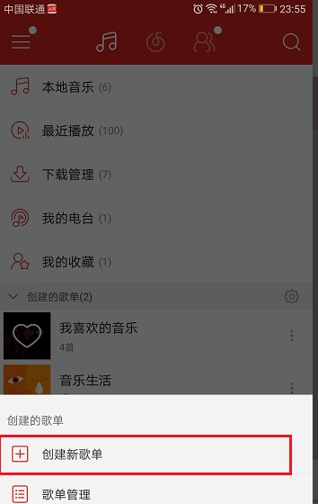 2、点击之后看到可以进行创建新歌单和歌单管理,我们先点击创建新歌单,如下图所示: