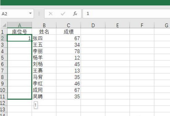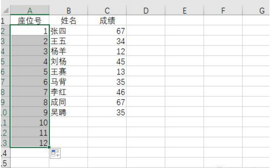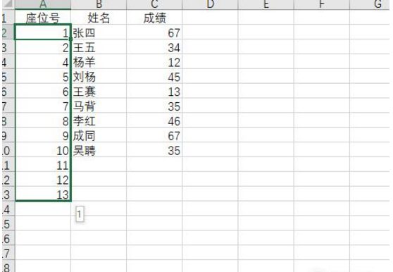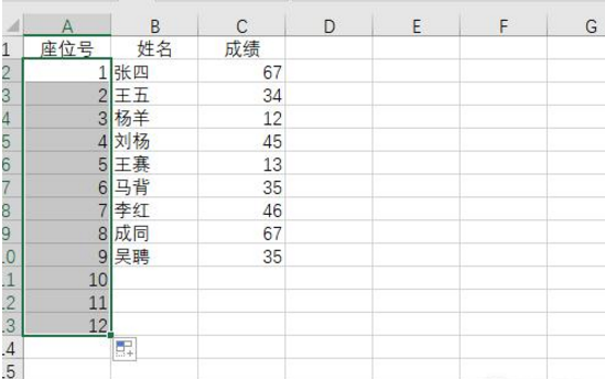 4、重新往下拖排序。想让顺序正确的话,那么需要重新选择序号那行,接着往下拖,这时候就能直接看到有新的序号生成。