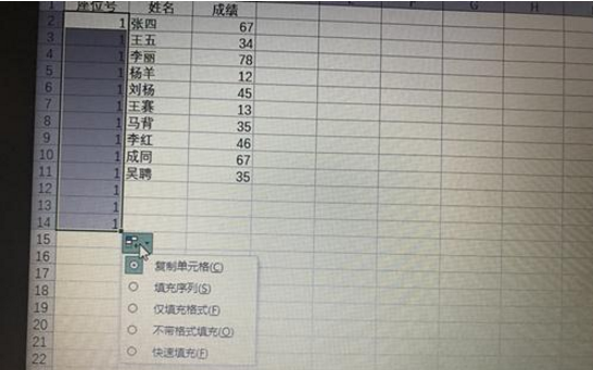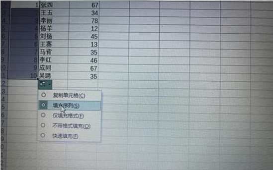 2、选择填充序号。默认情况下往下拖,有序号会复制,因此要将右边的十字打开,然后选择填充序号,这样就能进行序列地填充了。