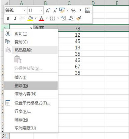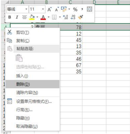 3、删除行修改方法。选择表格中的一行,这里用行三来演示,选择行三,然后点击右键,接着选择删除,这时候行三就删除了,此时行四移到了行三的位置,但是序列号依旧是4