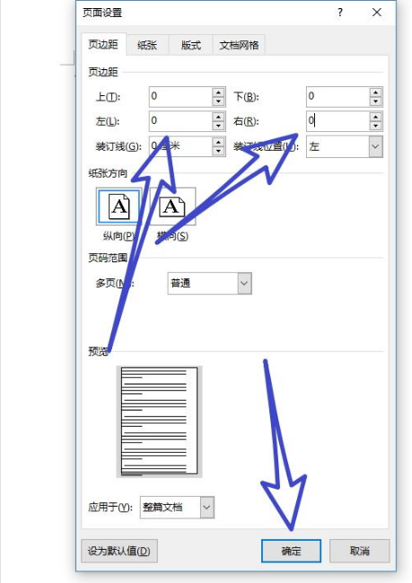3、在页面设置,我们把上下左右的页边距都调整为零,然后点击下方的确定。