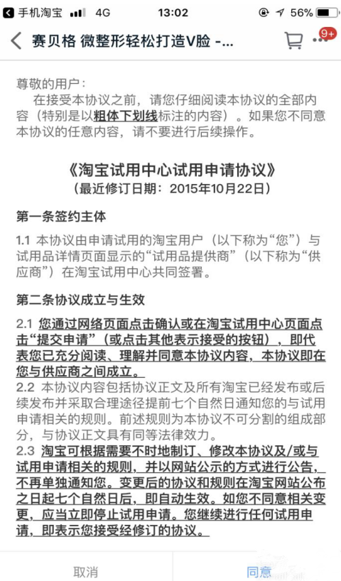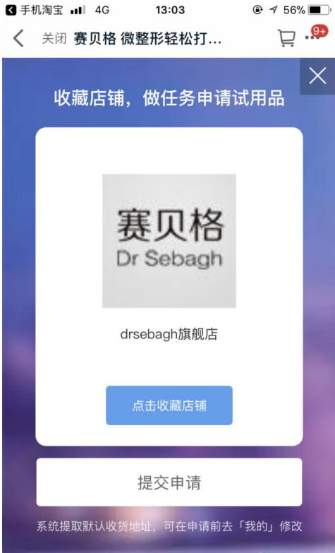 4、进入赛贝格免费试用页面,若要申请试用该产品,必须收藏该店铺,点击“免费试用”,阅读淘宝试用中心试用申请协议,阅读完毕点击“同意”,进入收藏店铺页面,点击“收藏店铺”,再点击“提交申请”。