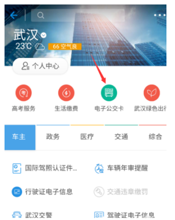 3、支付宝就会自动定位到你所在的城市了,如果你的城市开通了电子公交卡功能,那么在这个页面就会出现电子公交卡,我们点击选择它,如图,