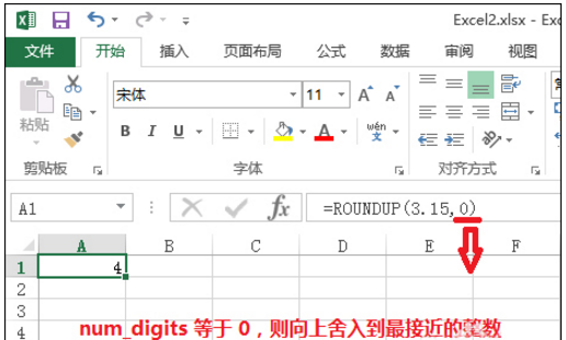 2、如图所示,当Roundup函数中参数 num_digits 等于 0,则向上舍入到最接近的整数。(因为向上舍入,所以为4)效果如图所示。