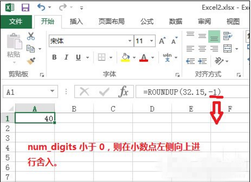 3、如图所示,当Roundup函数中参数 num_digits 小于 0,则在小数点左侧向上进行舍入。效果如图所示。