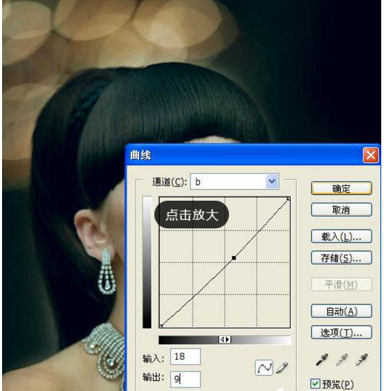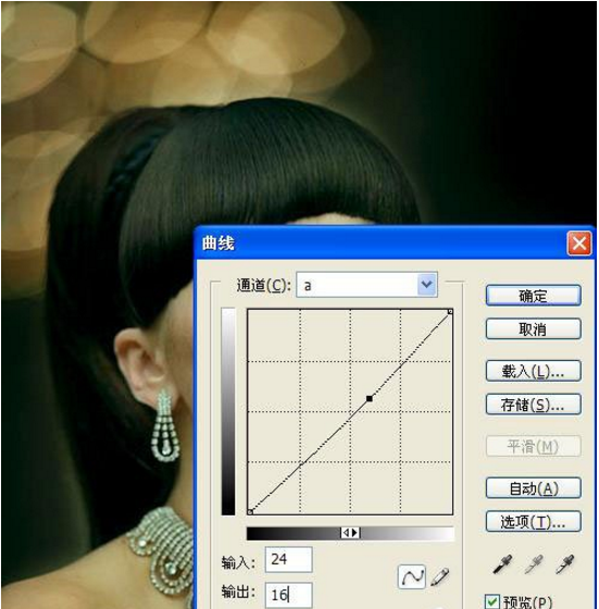 7、再按【Ctrl + Alt + Shift + E】进行盖印图层,适当磨皮,然后执行【图像】→【模式】→【Lab颜色】,同样选择【不合并】,然后按【Ctrl+M】进行曲线调节,a通道:输入:24,输出:16;b通道:输入:18,输出:9,如图所示: