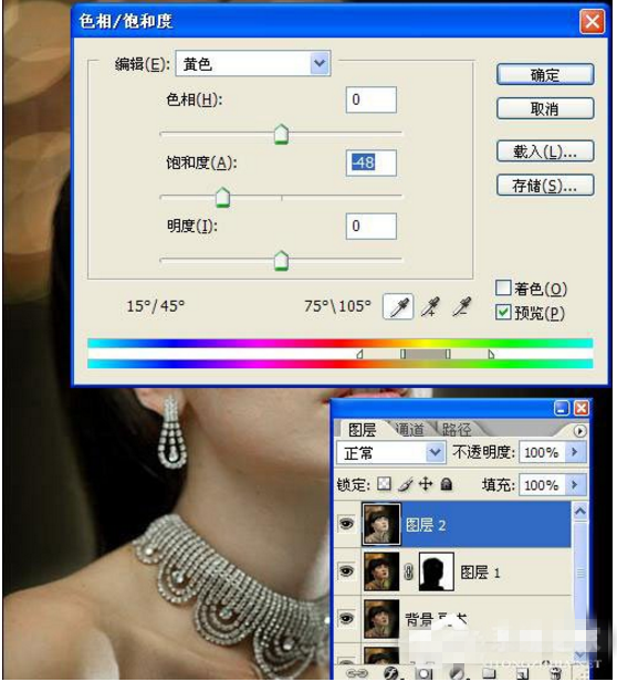 5、接着执行【图像】→【模式】→【RGB颜色】,同样不进行合并,这时我们重新转换到RGB模式,然后按【Ctrl + U】进行作适当的色相/饱和度调整,用吸管吸取人物脸部颜色,在饱和度选黄色调节,参数:-48,按【确定】,如图所示: