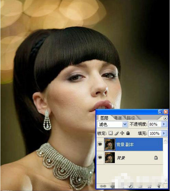 1、打开调色前的原素材图片,按【Ctrl+J】复制一层,把图层混合模式改为“滤色”,设置图层不透明度改为:80%,这时图片明显会变亮,如图所示: