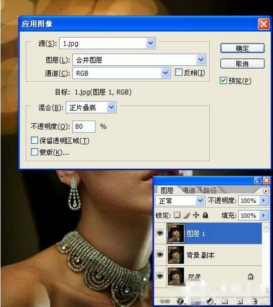 2、新建一个图层,按【Ctrl + Alt + Shift + E】盖印图层,然后选择【图像】→【应用图像】,参数设置如下:通道:RGB,透明度:80%,然后点【确定】,如图所示: