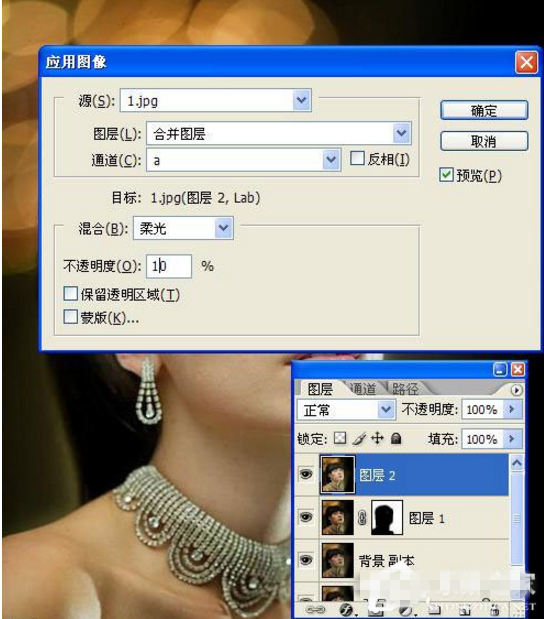 4、再新建一个图层,按【Ctrl + Alt + Shift + E】盖印图层,执行【图像】→【模式】→【Lab模式】,这时选择【不合并】,再执行【图像】【应用图像】具体参数:通道:a通道,模式:柔光,透明度:10%,如图所示: