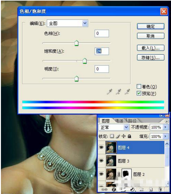 8、新建一个图层,按【Ctrl + Alt + Shift + E】进行盖印图层,执行【图像】【模式】【RGB颜色】从新转换到RGB模式,同样选择【不合并】,接着开始按【Ctrl+U】行行色相/饱和度调节图层,选择【全图】,饱和度:+24,如图所示: