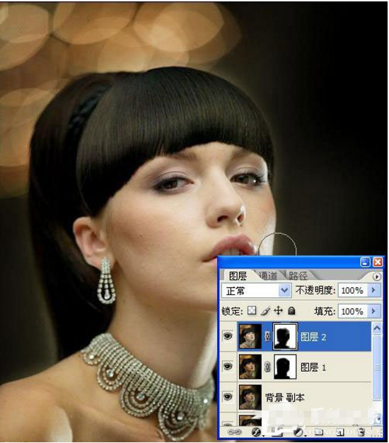 3、接着进行图层蒙版,选择黑色画笔把人物皮肤,头发,首饰等擦出来,如图所示: