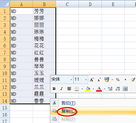 3、在第一列输入字母MD,大小写都行,双击右下角的黑十字自动填充,复制这两列内容。