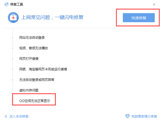 4、最后我们还可以在搜狗浏览器的右下方找到“搜狗浏览器修复工具”,里边就有QQ空间的修复功能,我们只需点击修复就可以了。