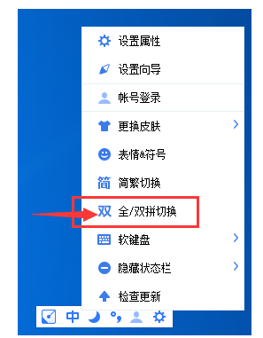 1、首先用快捷键“Ctrl+Shift”切换出手心输入法,接着我们右键点击其状态栏,在弹出的选项中点击“全/双拼切换”,当其前边的字变成“双”就代表我们开启了双拼模式。如下图所示: