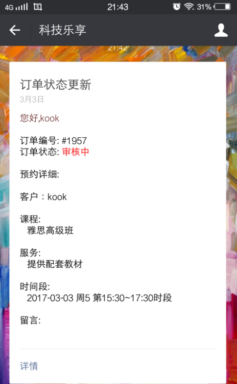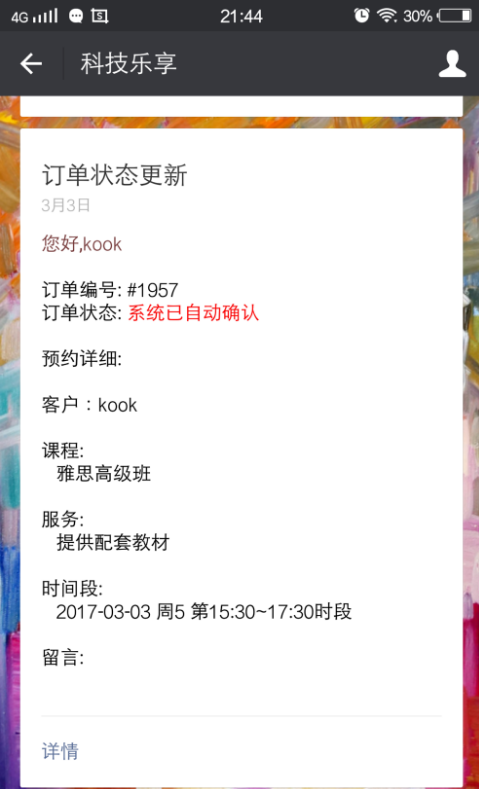 6、微信短信双重提醒,使客户不会忘记自己的预约的课程。