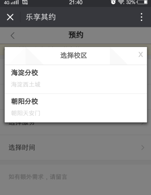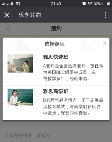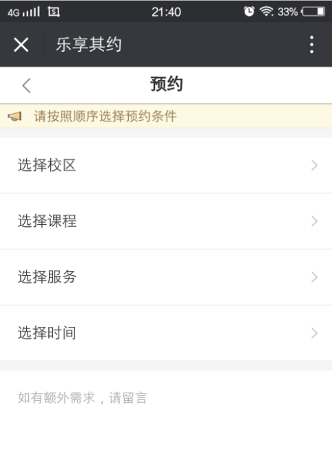 3、点击“约”字,便可进入相关的细节的选择界面,客户可以选择相应的上课区域,选择想上的课程等等。
