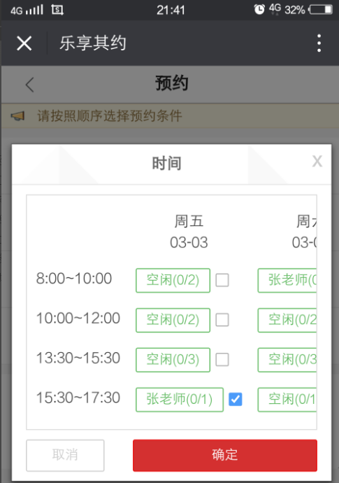 4、客户可以选择相应的上课区域,选择想上的课程,最重要的是客户可以根据自己的情况预约时间。商家可以根据授课老师的时间重新定义自主的预约时段,而客户则能够看到所有的预约时段的人数情况,避免造成拥挤或等待的情况。