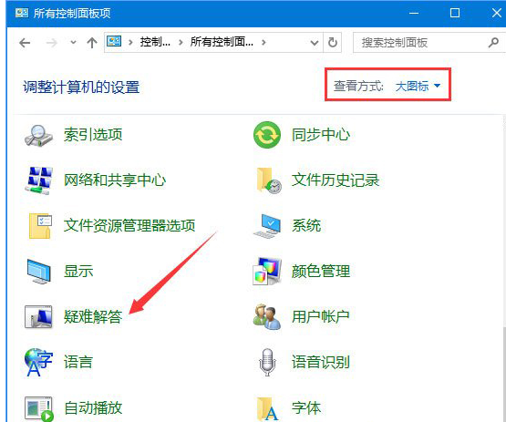 2、在控制面板中将查看方式改为大图标或小图标,点击打开“疑难解答”,