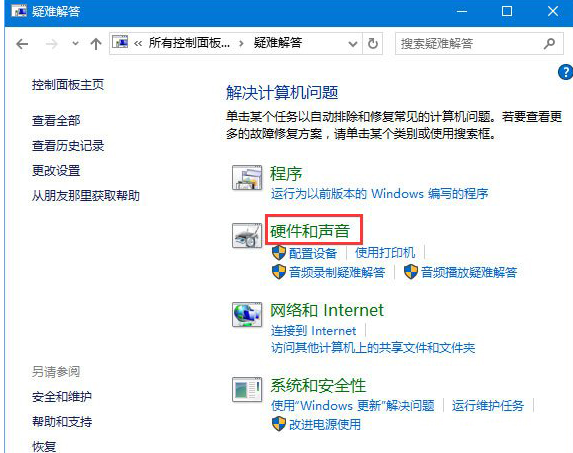 3、然后选择“硬件和声音”,