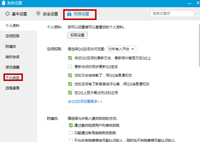4、在“”权限设置“”页面,滑动鼠标滚轮往下拉,找到“个人状态”选项,