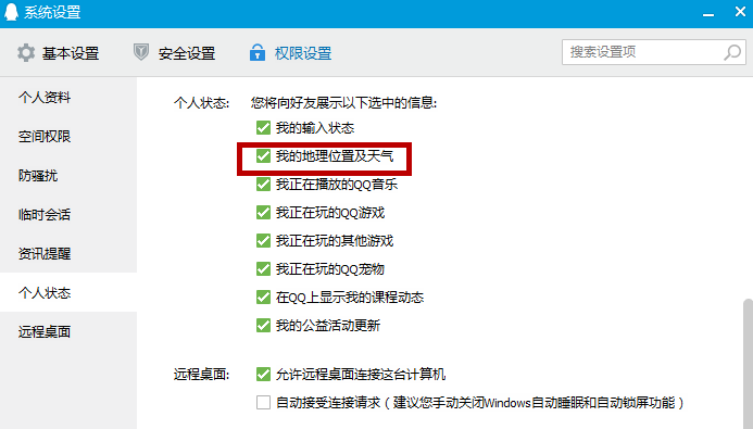 5、在个人状态下取消勾选“我的地理位置及天气”,