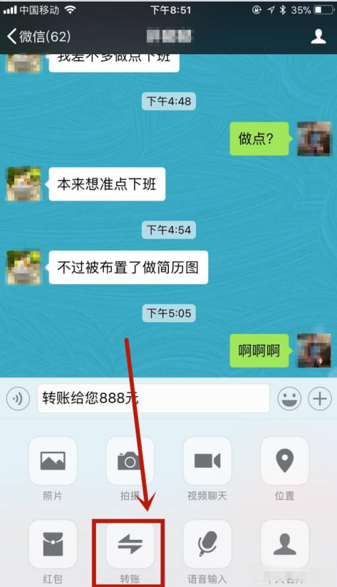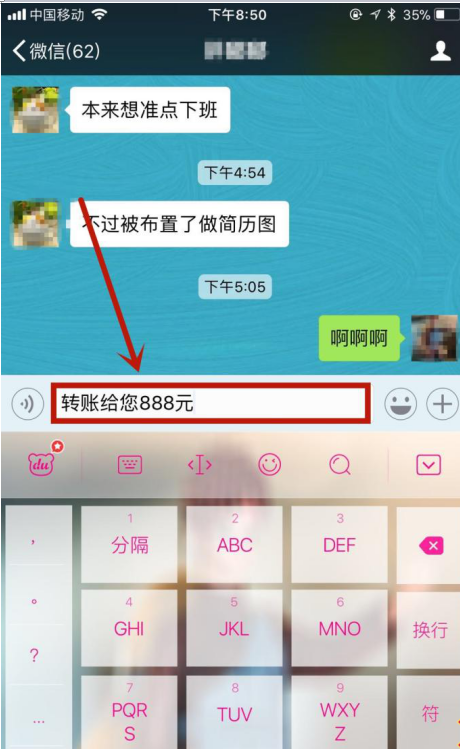 2、接着点击聊天对话框,然后键入“转账给你888”,如下图所示。
