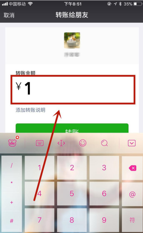 4、接着输入你的转账金额(当然是越小越好,本文以1元为例),如下图所示。