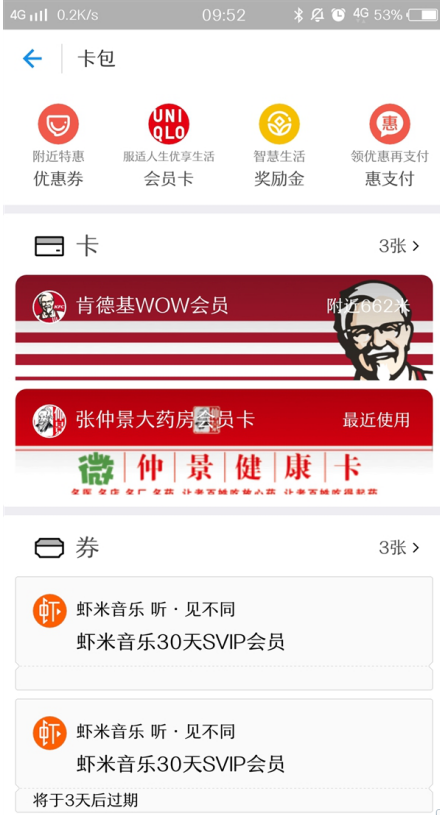 除了奖励金外,卡包内还有附近优惠券、线上线下联合会员卡、惠支付等等,均定位线下,归类条目更为清晰,同时也能通过奖励金向卡包功能引流。