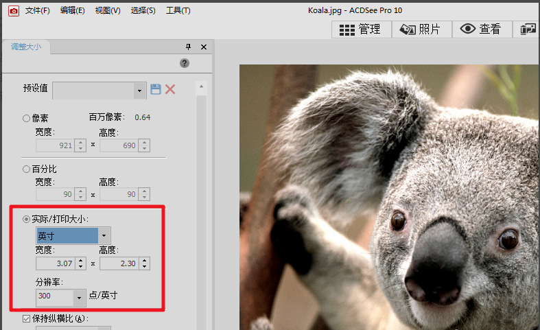 5、如果我们需要使用acdsee改图片分辨率我们选择实际/打印大小,在里面就可以改图片的分辨率了,同时还可以改宽和高。
