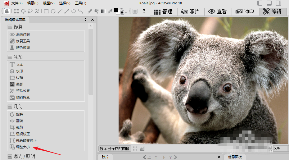 2、在acdsee看图软件的编辑中有很多实用的功能,堪比最强大的photoshop了,我们在左侧的几何中选择调整大小。